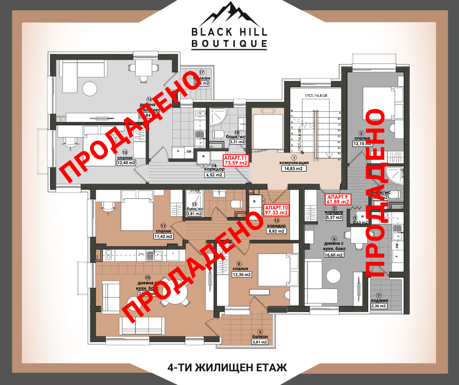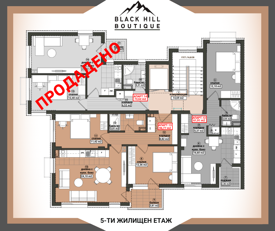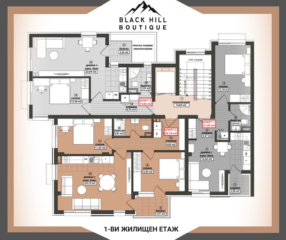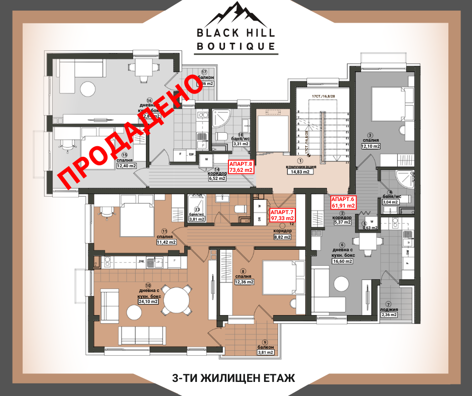 BLACK HILL - BOUTIQUE е малка уютна бутикова сграда с изчистен и елегантен дизайн, с локация гр. Бургас, ж.к. Меден рудник зона Б на бул. ‘’Александър Георгиев - Коджакафалията’’ до боулинг зала, кафене, спирка на градски транспорт, многообразие от магазини, училища, паркове и детски градини. Отлична архитектура позволяваща апартементи с прави форми и функционални разпределения. ‘’BLACK HILL - BOUTIQUE’’ се разпростира на надземна и подземна площ от 1 488.88 кв.м. РЗП, разпределени в един вход включващ: сутерен, партер и пет жилищни етажа. Изпълнение с висококачествени материали: хидроизолация, топлоизолация, немска дограма. На петте жилищни етажа са проектирани 14 апартамента, от които: 8 двустайни, 5 тристайни и 1 четиристаен. Подземен паркинг с 6 паркоместа. Партер с 4 единични гаража и двор, с 4 надземни паркоместа.