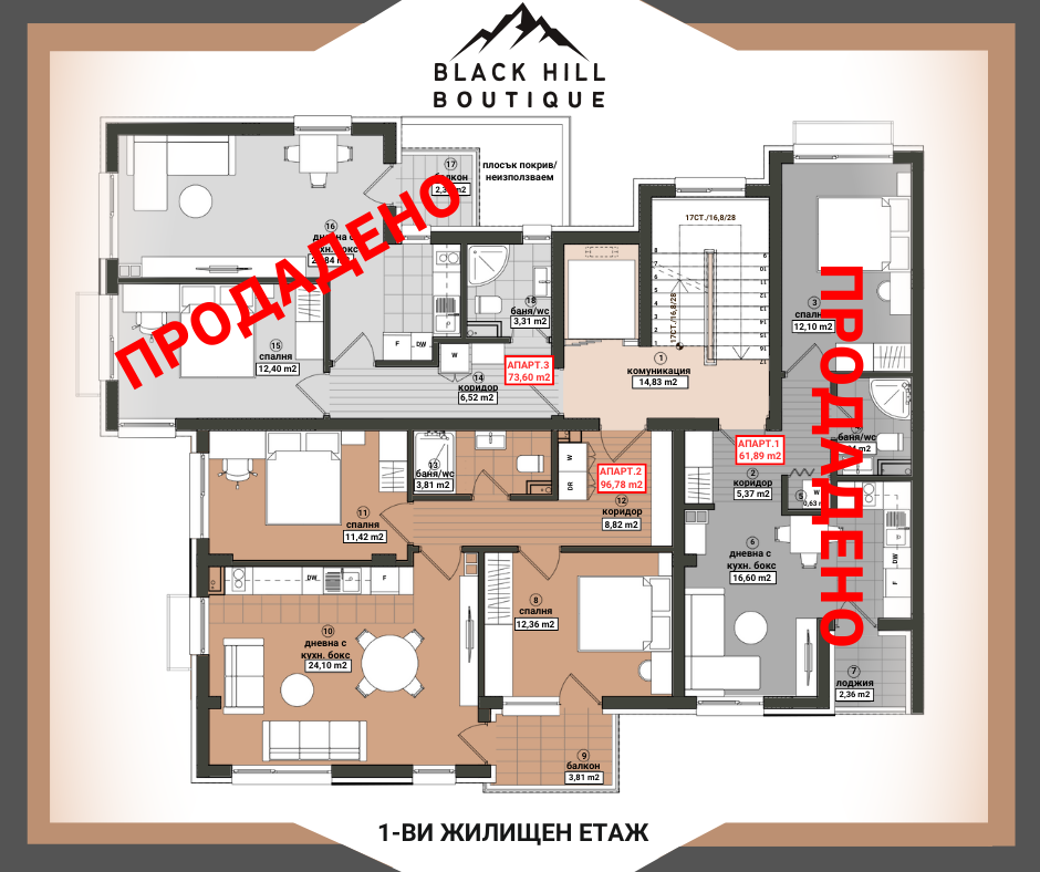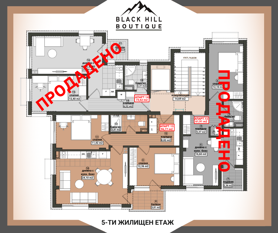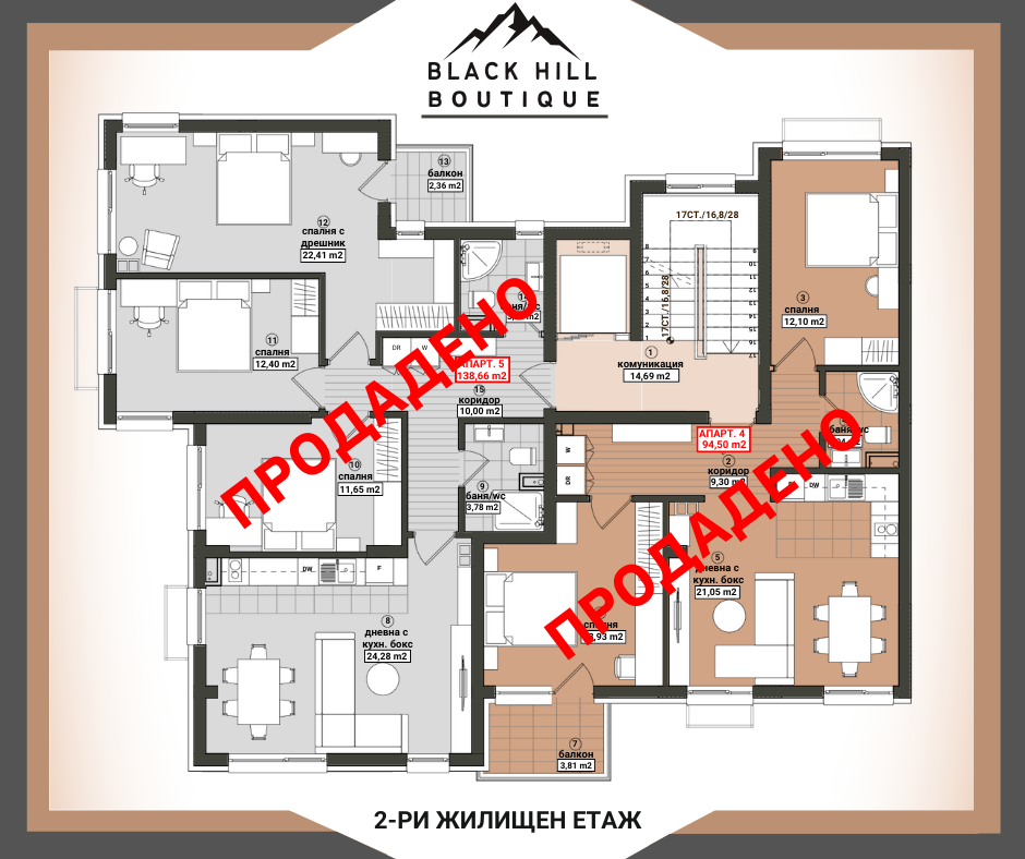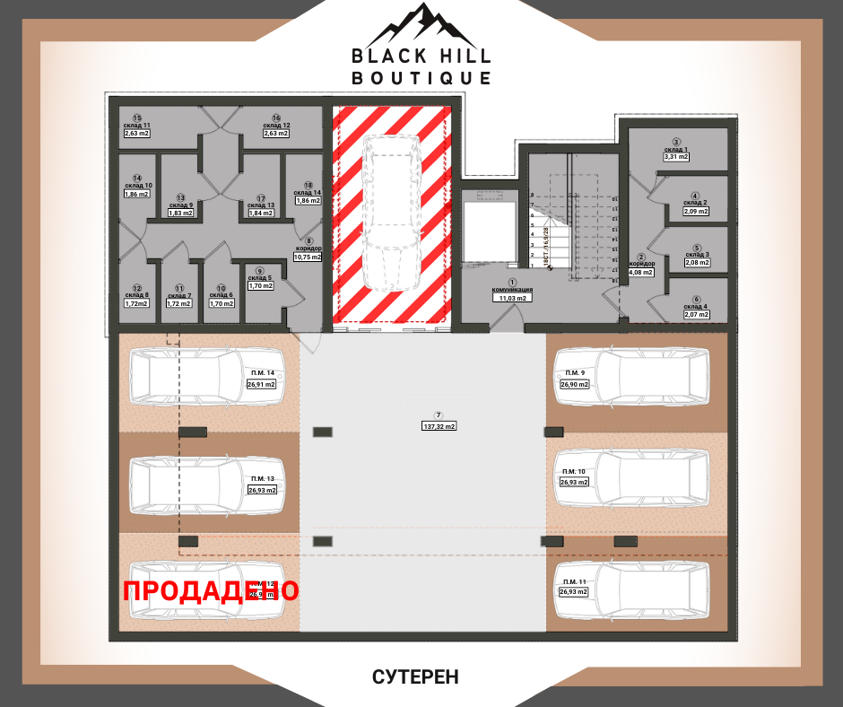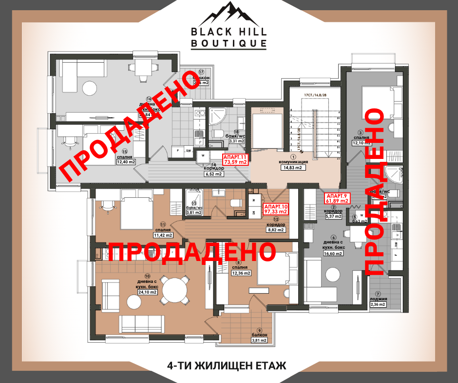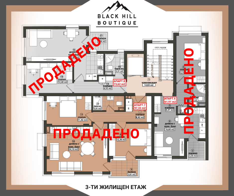 BLACK HILL - BOUTIQUE е малка уютна бутикова сграда с изчистен и елегантен дизайн, с локация гр. Бургас, ж.к. Меден рудник зона Б на бул. ‘’Александър Георгиев - Коджакафалията’’ до боулинг зала, кафене, спирка на градски транспорт, многообразие от магазини, училища, паркове и детски градини. Отлична архитектура позволяваща апартементи с прави форми и функционални разпределения. ‘’BLACK HILL - BOUTIQUE’’ се разпростира на надземна и подземна площ от 1 488.88 кв.м. РЗП, разпределени в един вход включващ: сутерен, партер и пет жилищни етажа. Изпълнение с висококачествени материали: хидроизолация, топлоизолация, немска дограма. На петте жилищни етажа са проектирани 14 апартамента, от които: 8 двустайни, 5 тристайни и 1 четиристаен. Подземен паркинг с 6 паркоместа. Партер с 4 единични гаража и двор, с 4 надземни паркоместа.